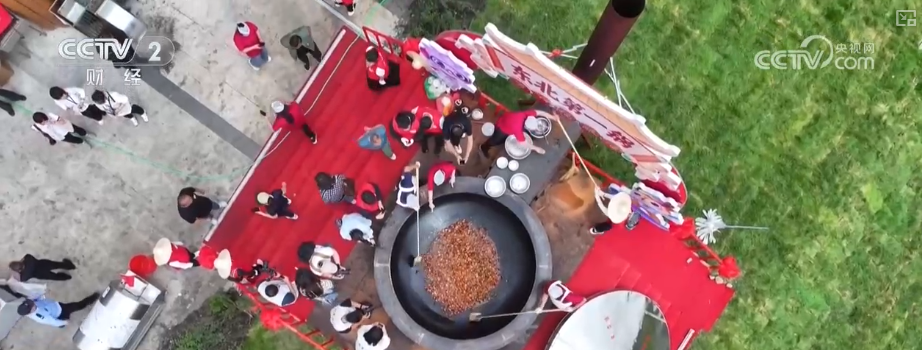 活动首日,当地厨师精选40只散养农家大鹅,剁块、焯水,再倒进大锅慢火焖炖,鹅肉的鲜香飘满整个景区。次日,铁锅又换上“新菜单”,近600斤新鲜五花肉分两锅烹制,经过翻炒、加酱、焖煮,最终变成色泽红亮的红烧肉。免费品尝的消息一传开,省内外游客纷纷赶来。